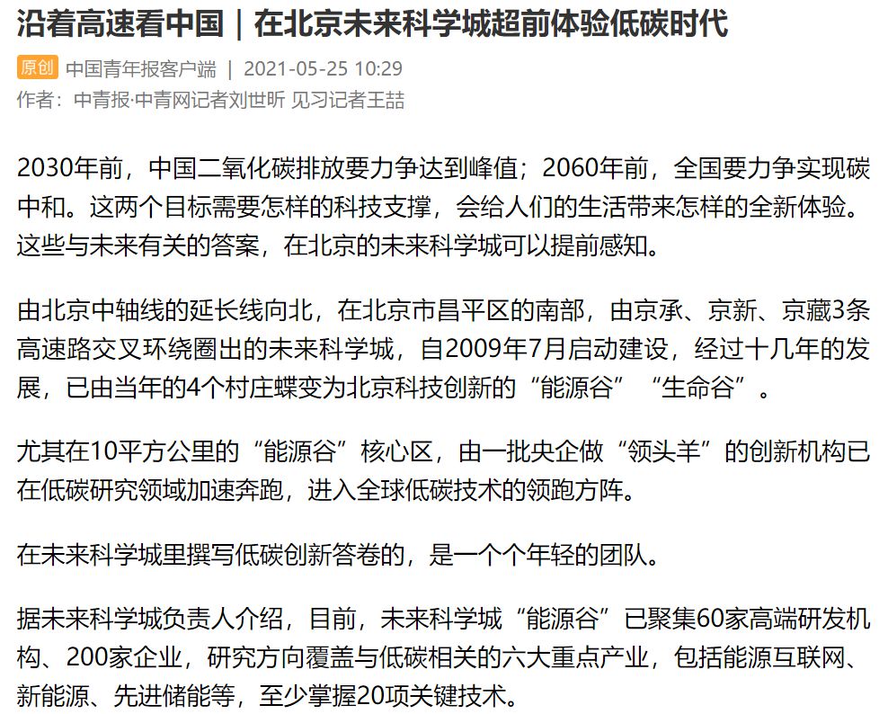 目前,未来科学城“能源谷”已聚集60家高端研发机构、200家企业,研究方向覆盖与低碳相关的六大重点产业,包括能源互联网、新能源、先进储能等,至少掌握20项关键技术。