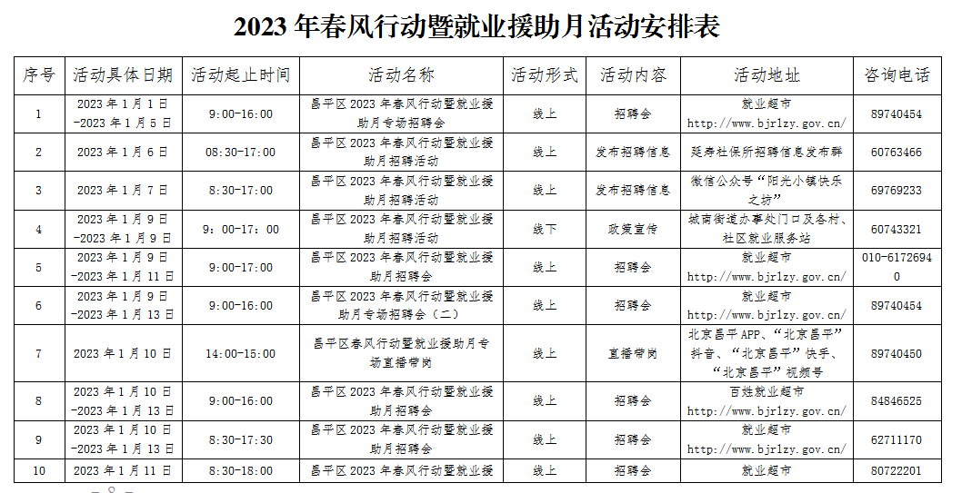 为全面贯彻党的二十大精神,坚决落实 党中央、国务院 、北京市和昌平区 关于就业工作决策部署, 根据《北京市 就业工作领导小组 办公室关于开展2023 年春风行动暨就业援助月的通知》(京就办发〔2022〕5 号) 要求, 昌平区决定于2023年第一季度开展“2023年春风行动暨就业援助月”专项服务活动, 摸排企业用工需求、 解决 企业 用工困难 , 集中帮扶 在 昌 务工人员、就业困难人员等劳动者就业创业。